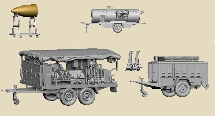 GEC72045 J37 Viggen Ground Support Armament Set, 5 different Items. Amsläpkärra 501, JA37 AM-LADA, Förädsvagn for RB71 Skyflash, m/71 Rocket Pod and Gun Pod. Developed by RB Rajput (RB Miniatures), Ordonnance by Wolf 3D Resin Parts. Also available in 1/48 as GE48045