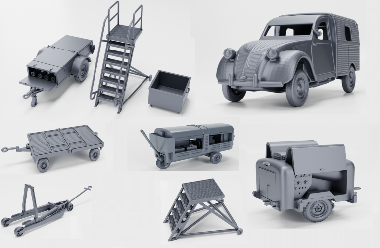 REG72019 French Air Force 1950s-1960s Ground Support Set. Also to be made available in 1/48 as REG48019 and in 1/32 as REG32019. Citroen 2CV Azu Staff Car, Ford U1000 Groupe de Demarage, Strüver Groupe de Demarage, Steinbock Chariot Elevateur de bombes, Rocher Remorque Armament, Cazenave Remorque Oxigene / Azote, Echelle de Servitude, Escabot de Servitude. Developed by Wargamer 3D